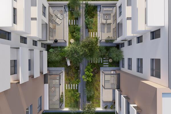 Dvě části domu vytvářející tvar písmene U nabídnou celkem 85 bytů o dispozicích 1+KK, 2+KK, 3+KK a 4+KK.